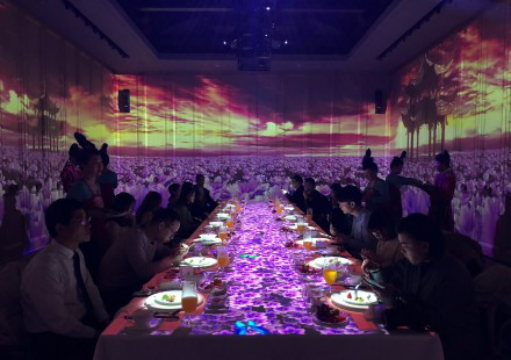 這種沉浸式餐廳 ,將全息投影技術與3D動畫相結合,以餐廳墻體、幕布、桌面、地面、天花等作為投影載體搭建一個動態變幻的環境場景,用光影科技來一場盛唐饕餮盛宴穿越!隨著時代的發展,人們生活水平逐漸提升,人們對餐廳的品味要求也在逐漸提高,光滿足味覺還不夠,還得滿足視覺,觸覺甚至聽覺嗅覺。